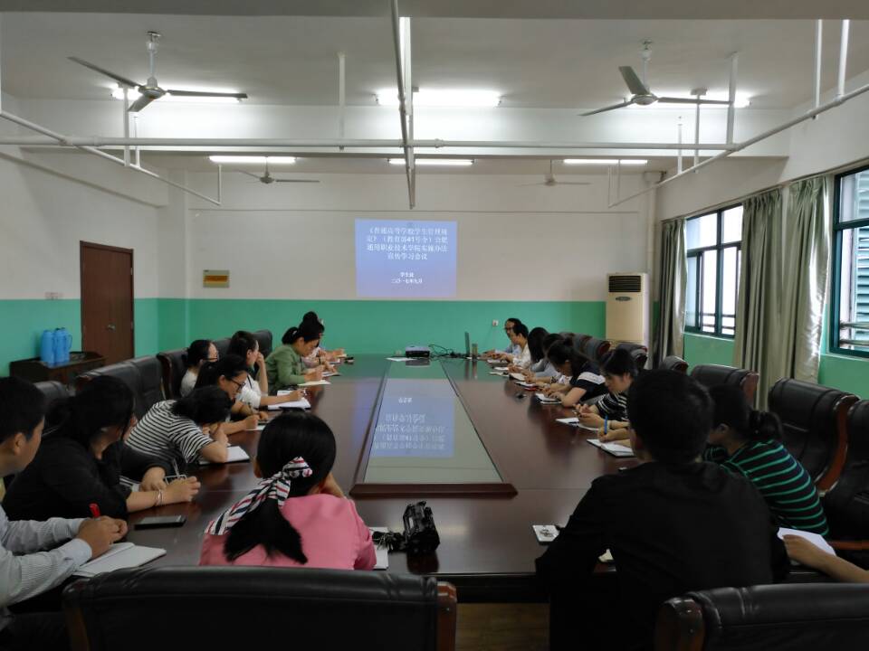 9月6日上午10点,学生管理人员工作例会在806会议室召开,专题学习《<普通高等学校学生管理规定>(教育部41号令)合肥通用职业技术学院实施办法》。各系党总支书记及全体辅导员、学生处工作人员参加了本次会议,基础部曾舒老师应邀出席了本次会议,会议由学生处处长安忠猛主持。