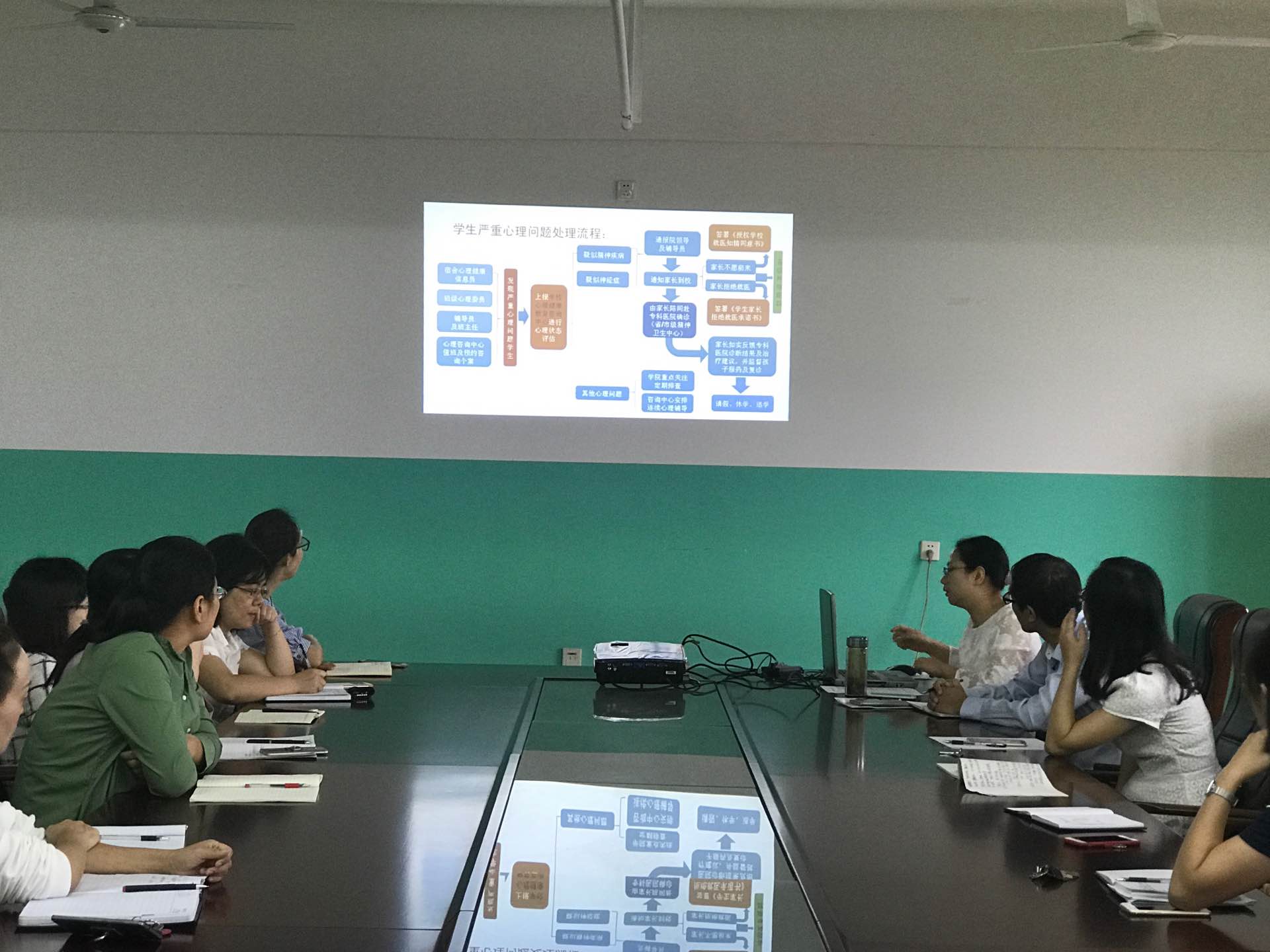 基础部曾舒老师带领大家学习《合肥通用职业技术学院学生心理危机干预工作规范化办法》。曾老师介绍了学生心理危机干预的工作流程,同时介绍了在面对有心理问题的学生时的工作注意事项,包括如何甄选特殊学生、精神障碍学生复学、对在校学习学生的工作流程以及辅导员和在校服药学生谈话要点等。