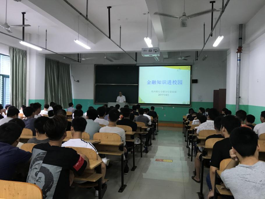 为加强大学生金融知识宣传教育,提高大学生风险防范和使用正规金融服务的意识,院团委与杭州银行合肥分行营业部联合开展了“金融知识进校园”专题讲座活动。活动于9月27日下午4:15在综合楼101教室举行,讲座由杭州银行合肥分行营业部总经理助理李健主讲,学院2017级近200名新生同学参加了此次活动。