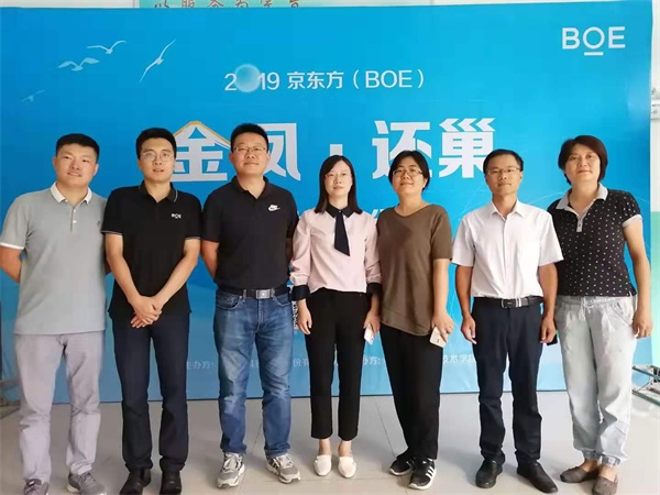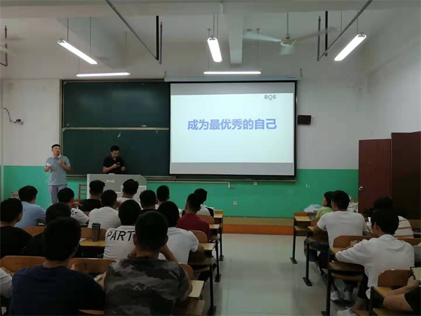 分享报告会开始前,院长助理兼机械工程系党总支书记薛晓妹、系主任宋敏和就业办公室主任胡传松在8楼会议室接待了来校参加活动的京东方人事科科长张宁、蒋天兵校友等一行。薛院助对张科长一行的来访表示欢迎,并介绍了学院相关专业建设情况。张宁科长介绍了在公司任职的我校毕业生的总体情况,并对学院为企业培养输送的大量高素质技能型人才表示感谢。蒋天兵校友在座谈中向系领导汇报了自己毕业工作以来的成长经历,同时也对母校的培养表示达了感恩之情。据介绍,截止目前在京东方工作的我院毕业生有200多人,其中近100名毕业生已经走向了基层和中层管理岗位。座谈会后,企业方还向学校赠送了电子画屏。