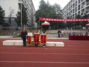 在庄严的国歌结束之后,由总裁判长凌军老师宣布比赛成绩。经过了两天的激烈角逐,信管3队、信管1队分获团体总分第二名、第三名,信管2队摘得团体总分桂冠。信管2队、信管3队获得优秀组织奖;信管1队、数控2队获得体育道德风尚奖。随后,院领导为获奖的老师和同学颁发了荣誉证书和锦旗。最后张书记对本次运动会进行了总结,并宣布运动会闭幕,希望大家把运动精神延续到学习上和工作上,再接再厉,再创佳绩。