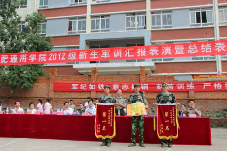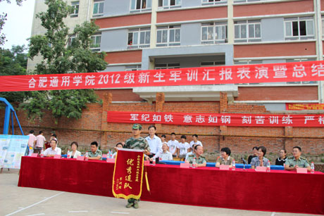 9月22日下午,我院2012级新生军训汇报表演暨总结表彰大会在运动场隆重举行。合肥通用机械研究院党委副书记、副院长兼合肥通用职业技术学院党委书记贾晓枫,学院院长、党委副书记束蓓,学院党委副书记、副院长兼2012级军训团团长田启昌,学院副院长黄蕾,院长助理、学生处处长兼军训团政委陈立,解放军电子工程学院学员二系政委吴志君及各系部党政负责同志、军训教官和指导员参加了大会。大会由学院学生处副处长兼2012级军训团副团长安忠猛老师主持。