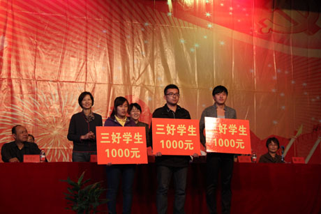 随后,在欢快的乐曲声中学院对获得三好学生、优秀学生干部、先进班集体等荣誉的集体和个人进行了表彰。获奖学生代表李以能发表了获奖感言,表达了对学院领导、老师衷心的感谢与诚挚的敬意,并表示要以此为新起点,努力学习,积极进取,争取取得更大的成绩。