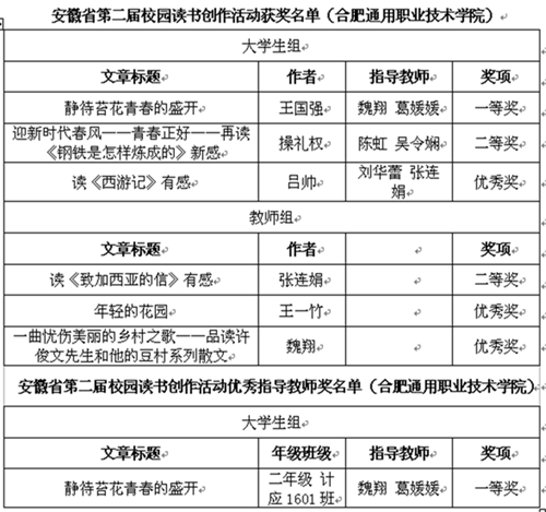 近日,安徽省委教育工委、安徽省教育厅公布了第二届校园读书创作活动的结果,我院成果颇丰。本次活动于2018年3月启动,各部门积极组织报送,教职工作品共22篇,学生作品共57篇。由学生处牵头,成立10人组成了专门的评审委员会,安排专人担任学生指导教师,经过三轮评选和作品指导形成定稿,评出校级获奖作品,颁发荣誉证书,根据文件要求,按人数比例,推荐3篇教师作品和4篇学生作品上报至安徽省组委会,最终6篇文章获奖,学生作品和教师作品各3篇,其中一等奖一篇,二等奖二篇,优秀奖三篇。魏翔老师和葛媛媛老师获优秀指导教师奖。我院获得优秀组织奖。