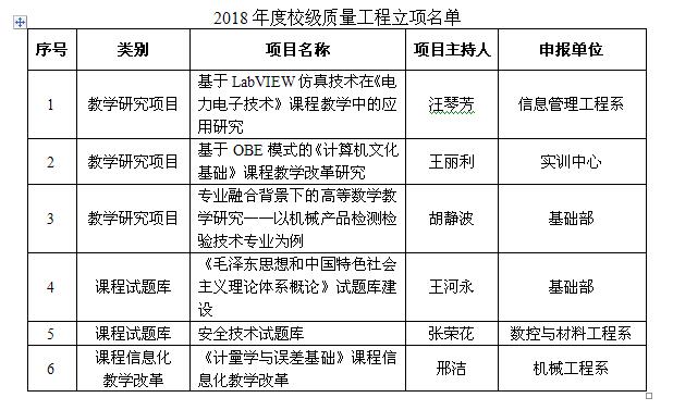 本次校级质量工程立项范围包含教学研究项目、课程试题库以及课程信息化教学改革三大类别。通过校级质量工程的建设,旨在深入推进我院专业与课程建设,深化教育教学改革,同时为我院申报省级质量工程奠定基础。