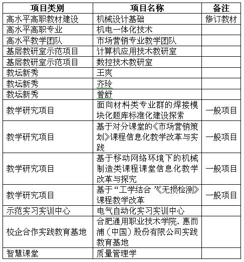 近日,安徽省教育厅公布了2018年度高等学校省级质量工程项目拟立项名单,我院在省级质量工程项目申报工作中再次获佳绩, 15个申报项目均获省教育厅评审立项,申报立项范围和数量均实现突破。本次获批立项的项目涵盖1个高水平高职专业、1个高水平教学团队、2个基层教研室示范项目、1个示范实习实训中心、1个校企合作实践教育基地、1个智慧课堂、4个教学研究项目、3个教坛新秀。其中,高水平高职教材建设、基层教研室示范项目首次获批立项。具体立项名单如下: