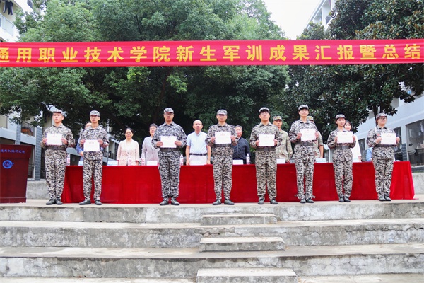 2025年9月29日上午,合肥通用职业技术学院2025级新生军训成果汇报暨总结表彰大会在学院运动场举行。学院党委书记田启昌,蜀山区委常委、区人武部部长唐泊,学院党委副书记、院长江道银,副院长薛晓妹、肖艳君、蒋腊芳,院长助理凌军出席典礼。学院系党总支书记、学生处、院团委、新生辅导员、军训教官及2025级新生参加。大会由学生处处长徐世影主持。