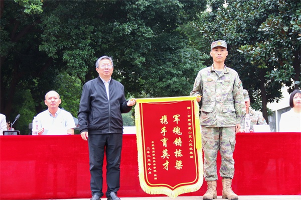 田启昌书记代表学院向承训单位合肥市蜀山区人武部赠送锦旗,向全力支持学校军训的全体教官致以诚挚的感谢与崇高敬意。
