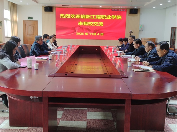 信阳工程职业学院机电与信息工程学院院长王吉周、纺织服装学院院长陶新南、汽车工程学院院长李翔、党工委办公室主任马健、就业创业指导中心副主任孙治磊一同来学院交流。学院副院长肖艳君、副院长蒋腊芳、机械工程系主任张荣花、电气与信息工程系主任何旭、招生就业办副主任谷宗全参加会议。