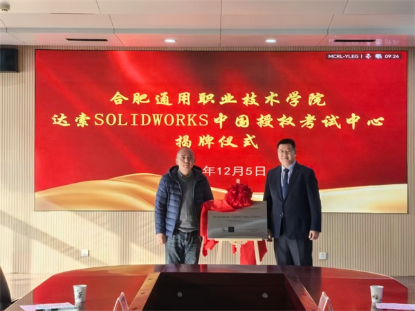 近日,合肥通用职业技术学院隆重举行“DS SolidWorks 中国授权CSWA考试中心”揭牌仪式。法国达索软件大中国区教育经理窦强、教育市场高级顾问严海军,合肥通用职业技术学院院长江道银、培训中心主任谢超、机械工程系副主任桂瑞峰,南京金步信息科技有限公司(达索授权安徽区域教育核心经销商)总经理丁正飞、销售经理陈宇航等领导嘉宾共同出席仪式,见证这一校企深度合作的重要时刻。