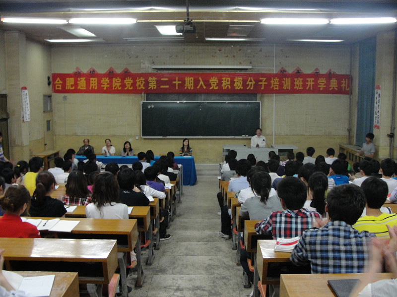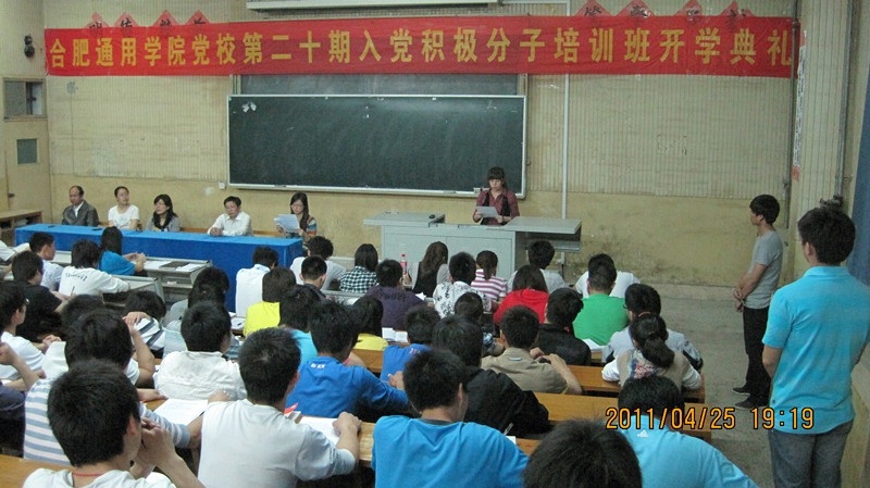 按照学院党委、党校工作安排,我院党校第二十期入党积极分子培训班的各项培训工作已正式启动。2011年4月25日晚19:00我院党校第二十期入党积极分子培训班开学典礼在多媒体c104教室举行。合肥通用职业技术学院党委副书记、副院长、党校校长田启昌同志及各系党总支书记出席开学典礼。开学典礼仪式由学院团委汤雪花同志主持。